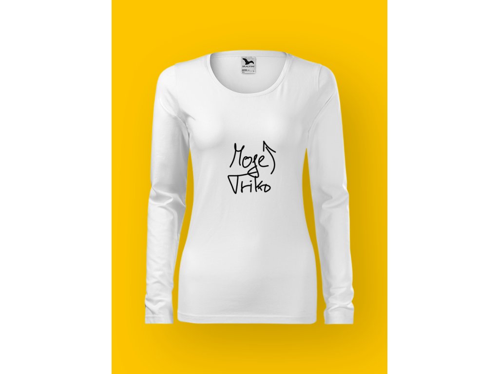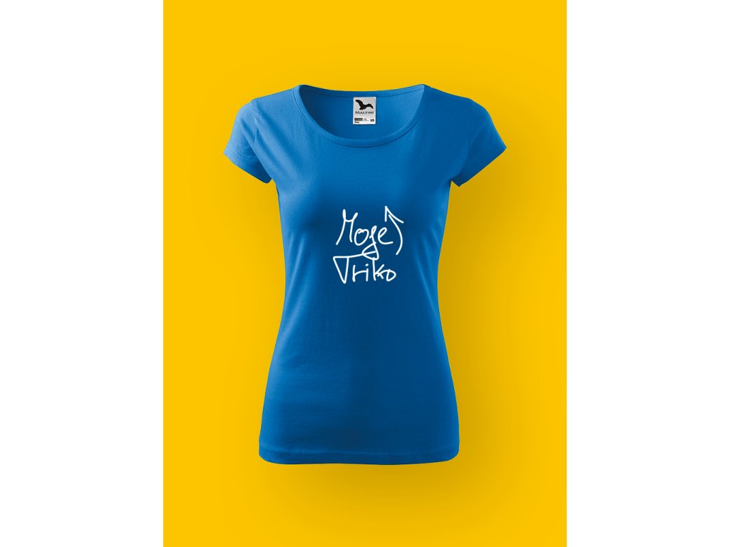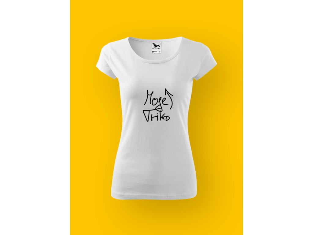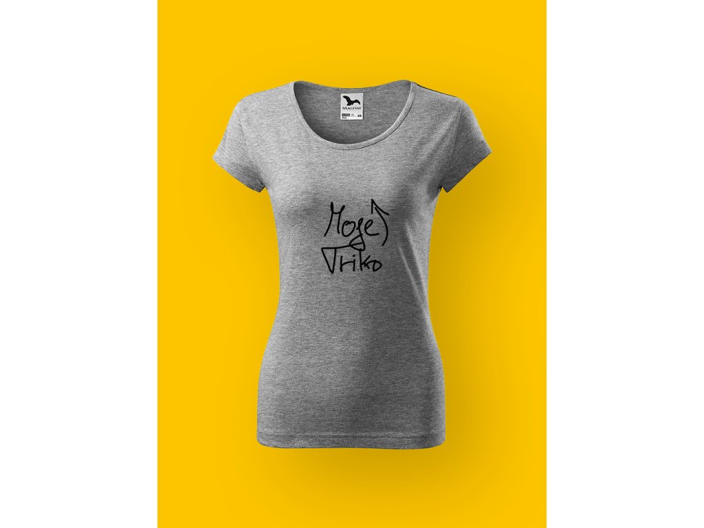 Moje tričko ukazuje jasné oznámení vlastnictví. Jednoduchej nápis, jasnej jak facka a vzkaz, kterej pochopí i ten nejpomalejší kamarád s tendencí „jen si ho půjčím na chvíli“.