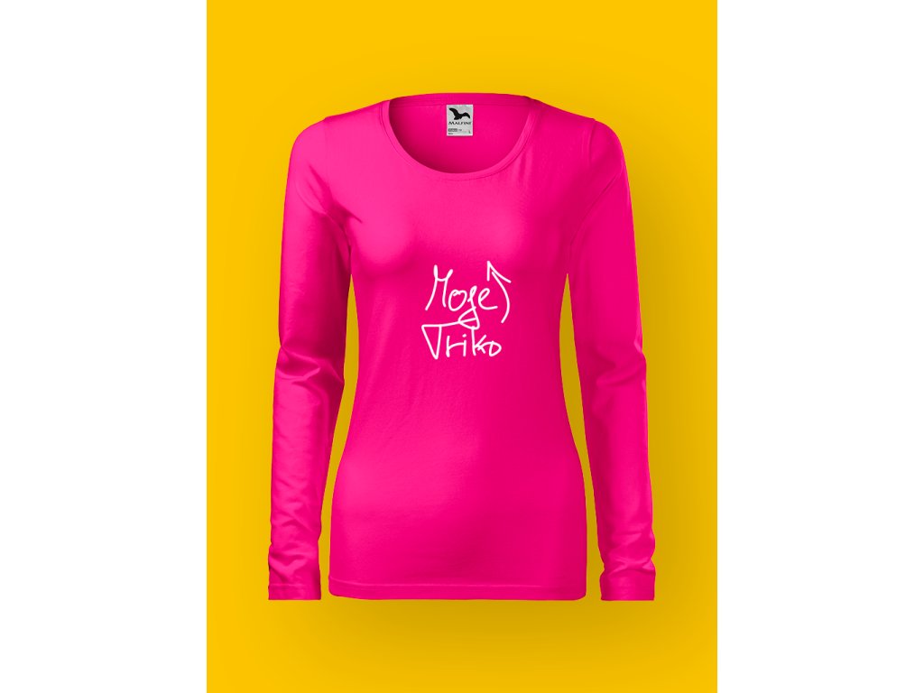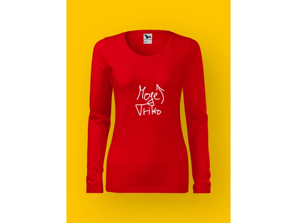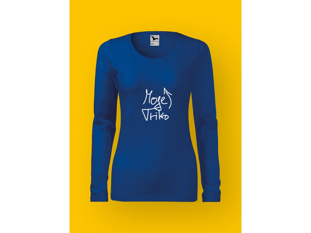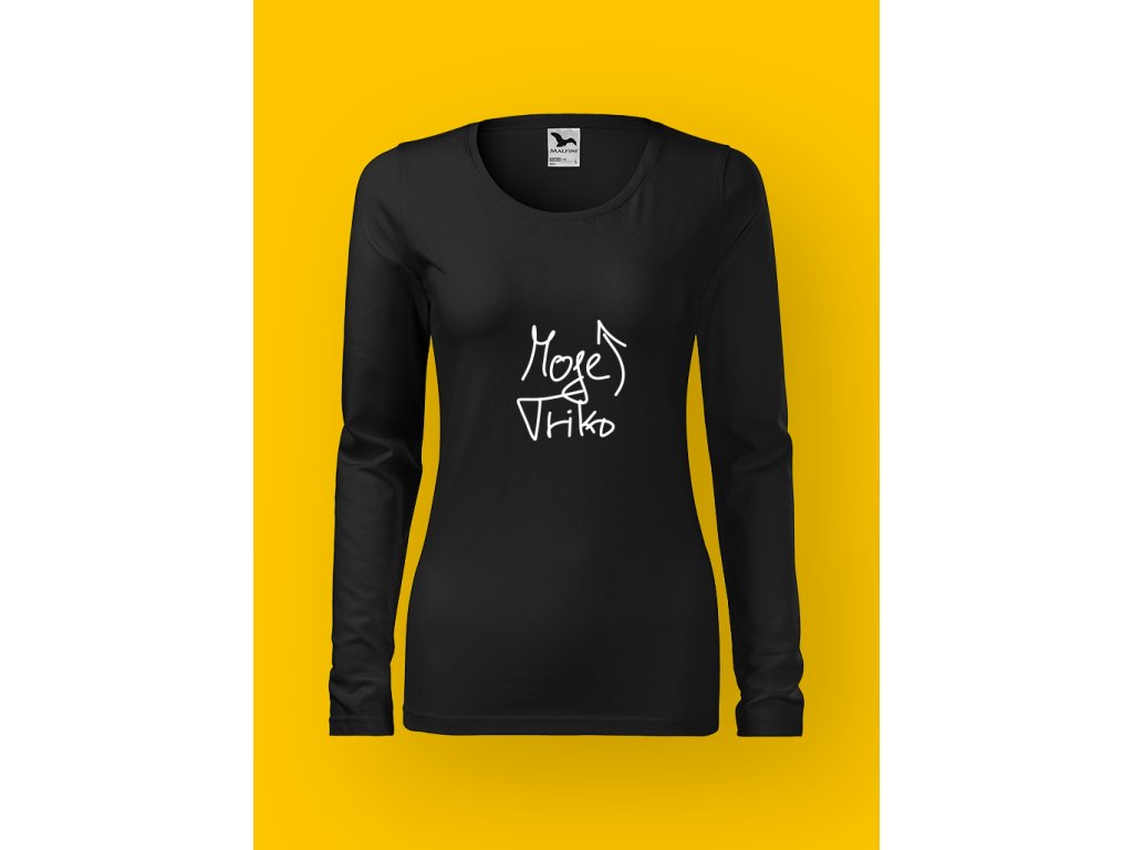 Moje tričko ukazuje jasné oznámení vlastnictví. Jednoduchej nápis, jasnej jak facka a vzkaz, kterej pochopí i ten nejpomalejší kamarád s tendencí „jen si ho půjčím na chvíli“.