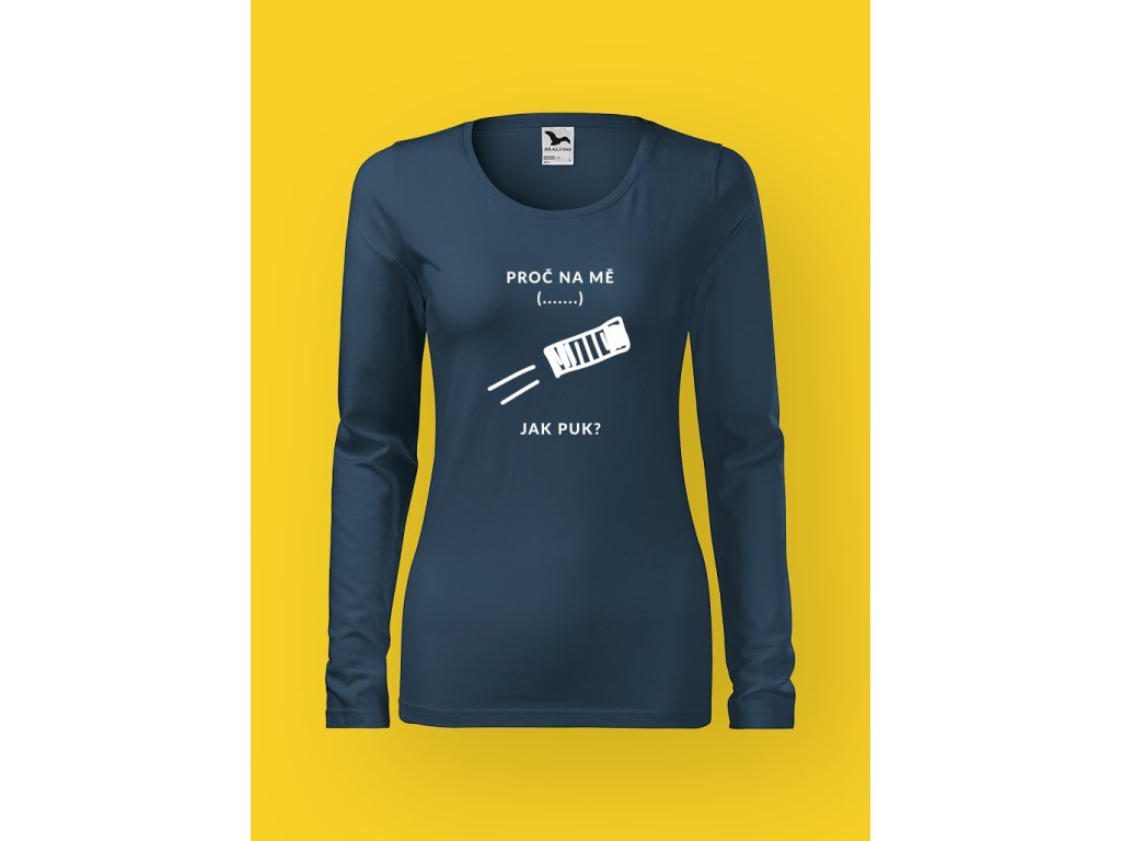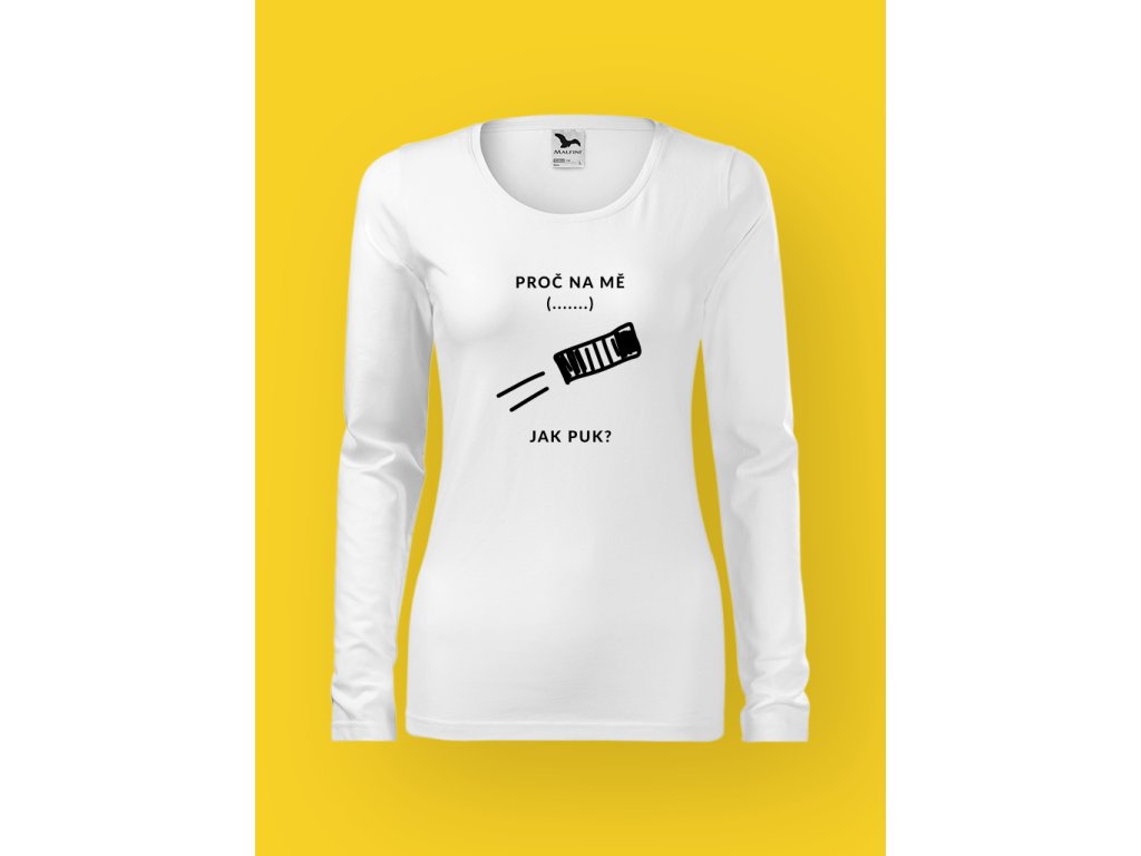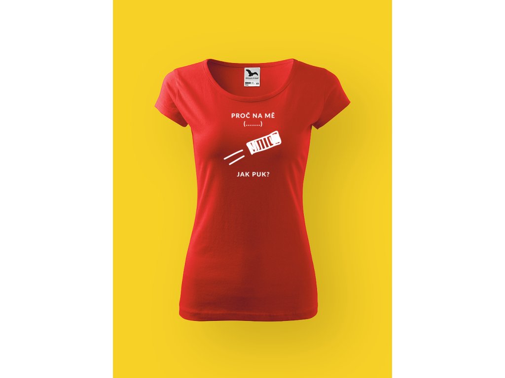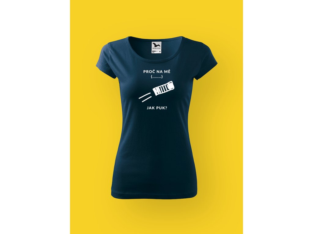 Dámské tričko s potiskem PROČ NA MĚ JAK PUK?
