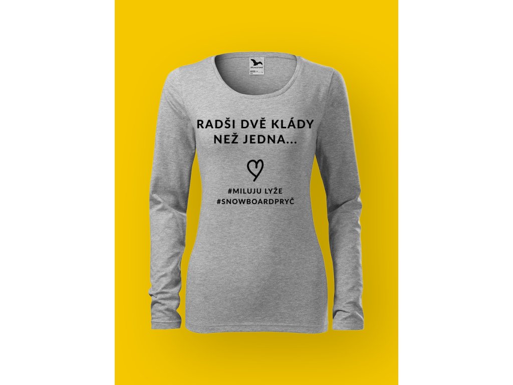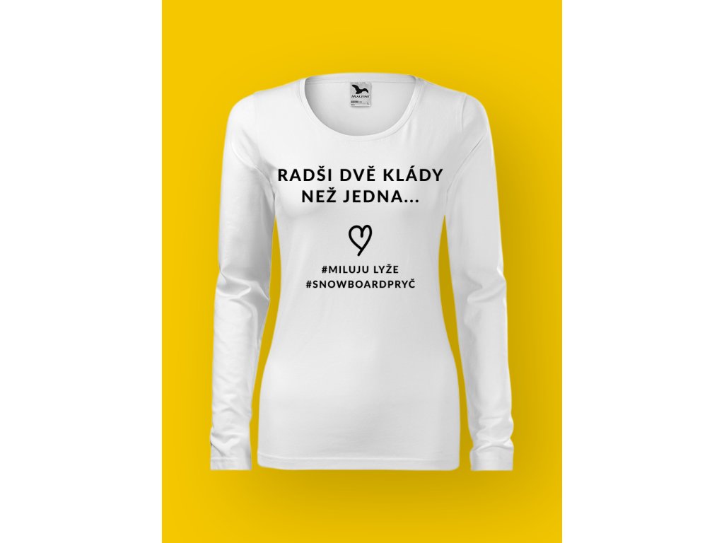 Tohle tričko je přesně ten typ humoru, který na svahu ocení úplně každý — no dobře, skoro každý. Hláška „Radši dvě klády než jedna…“ vypadá na první pohled jako nevinný lyžařský slogan, ale každý s funkční fantazií ví, že tohle je dvojsmysl, který se nedá nechat bez povšimnutí.