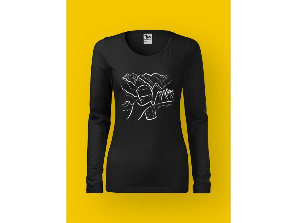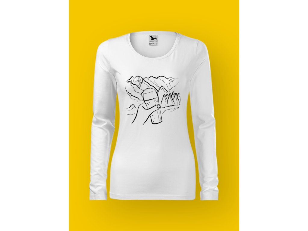 Potisk krásně vystihuje realitu horských výprav: funíš, potíš se, přemýšlíš, proč to děláš… a pak uvidíš pivo a najednou má všechno smysl. Půllitr na skále je přesně ten typ motivace, kvůli které i nejprudší stoupání působí jako lehké zahřátí.