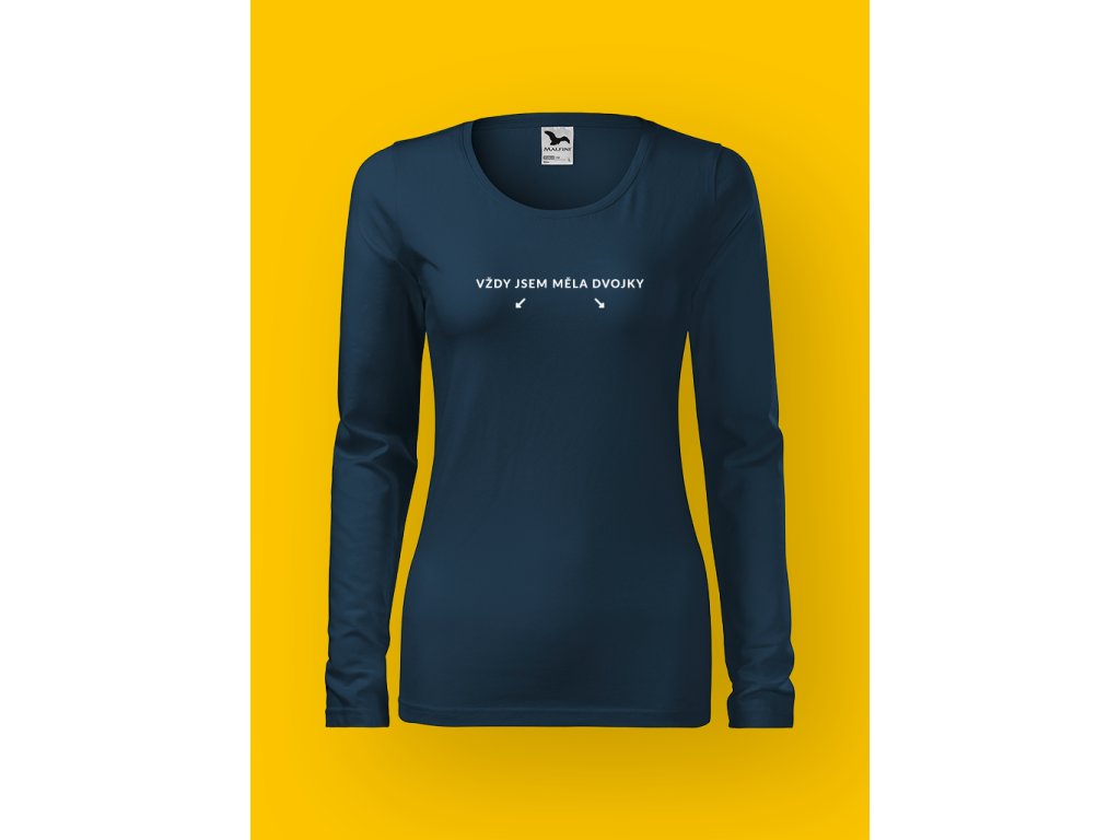 Tohle tričko nepotřebuje dlouhý vysvětlování. Nápis VŽDY JSEM MĚLA DVOJKY doplněný šipkami je dvojsmysl tak jasnej, že ho pochopíš na první pohled. A jo – přesně tam, kam se díváš.