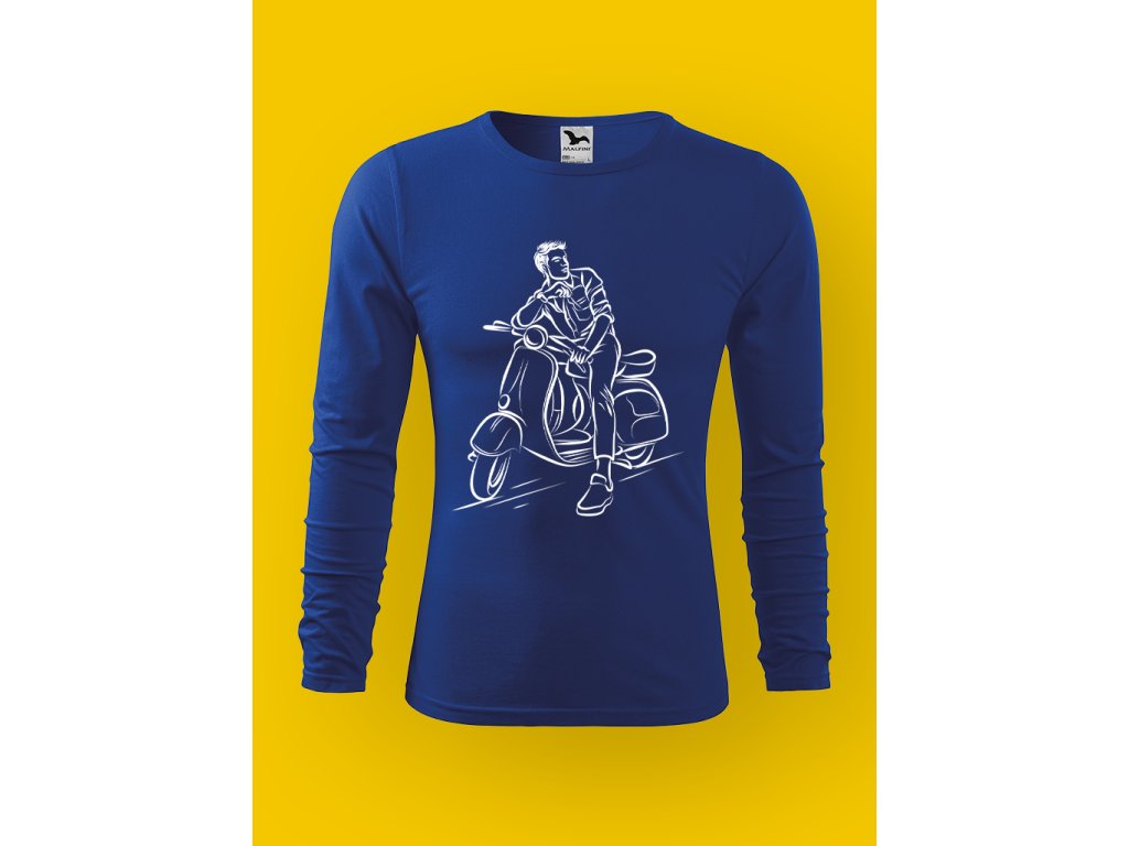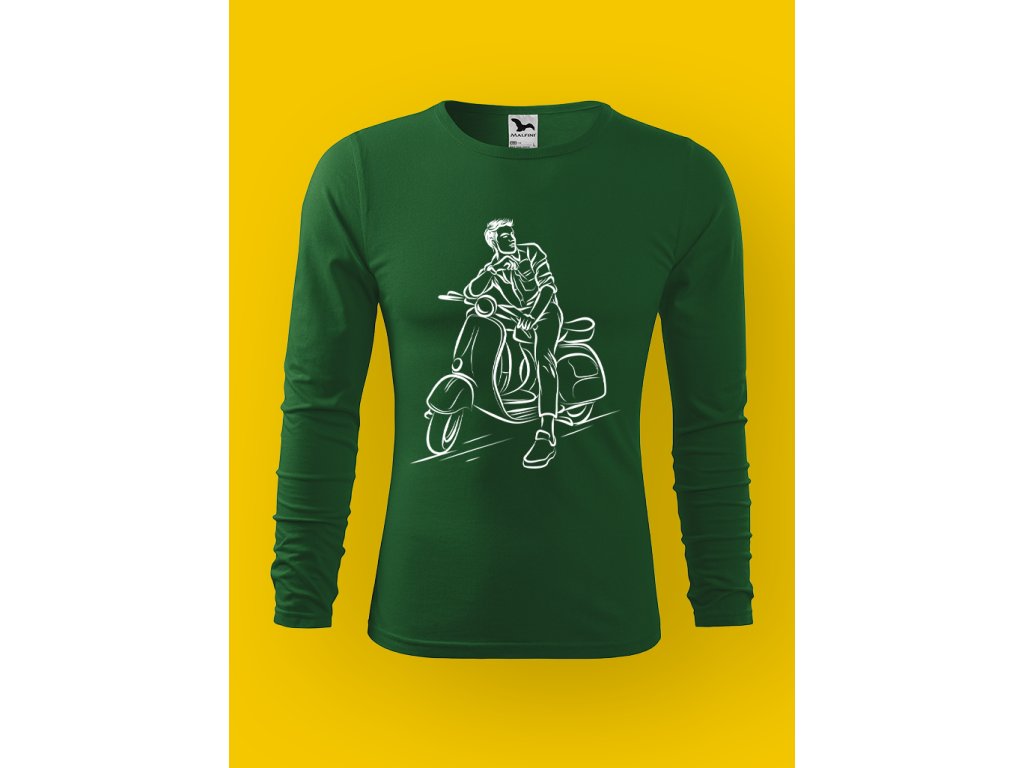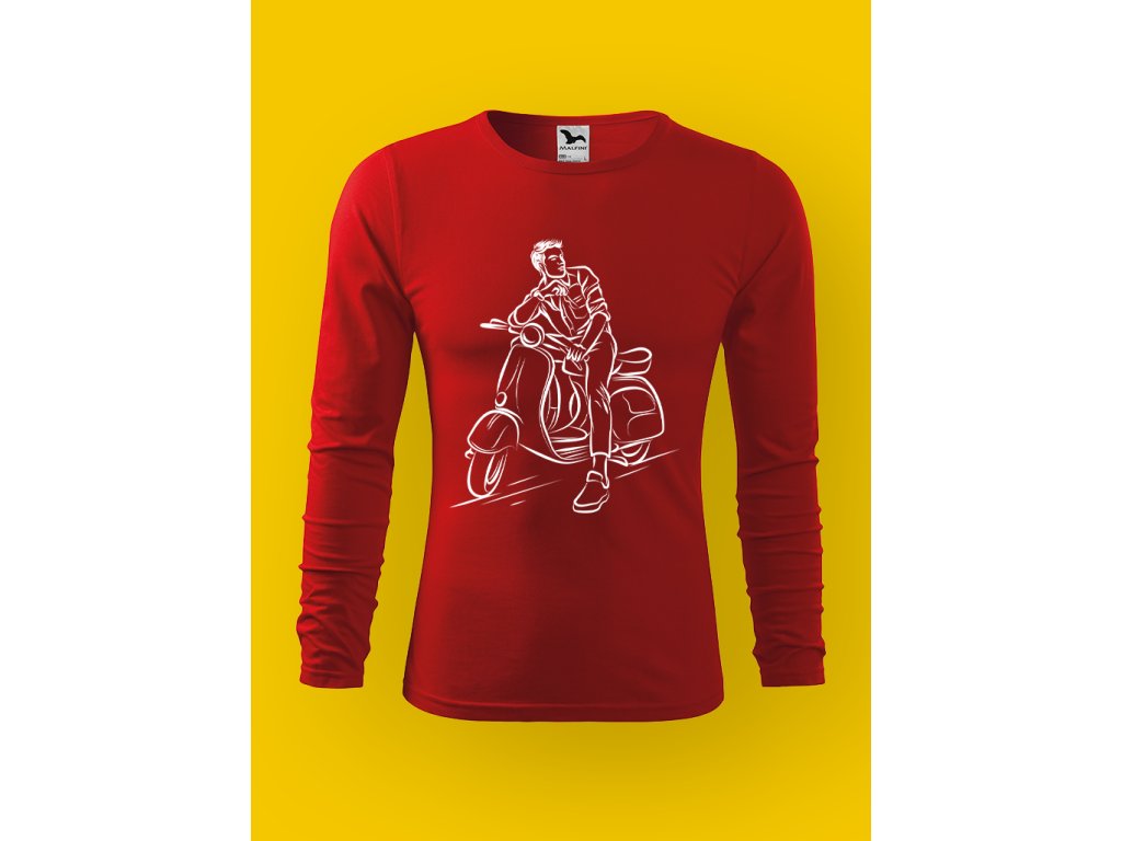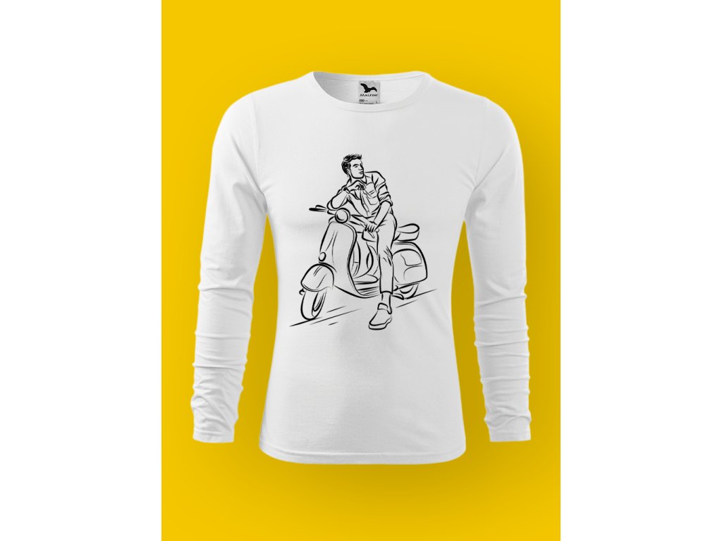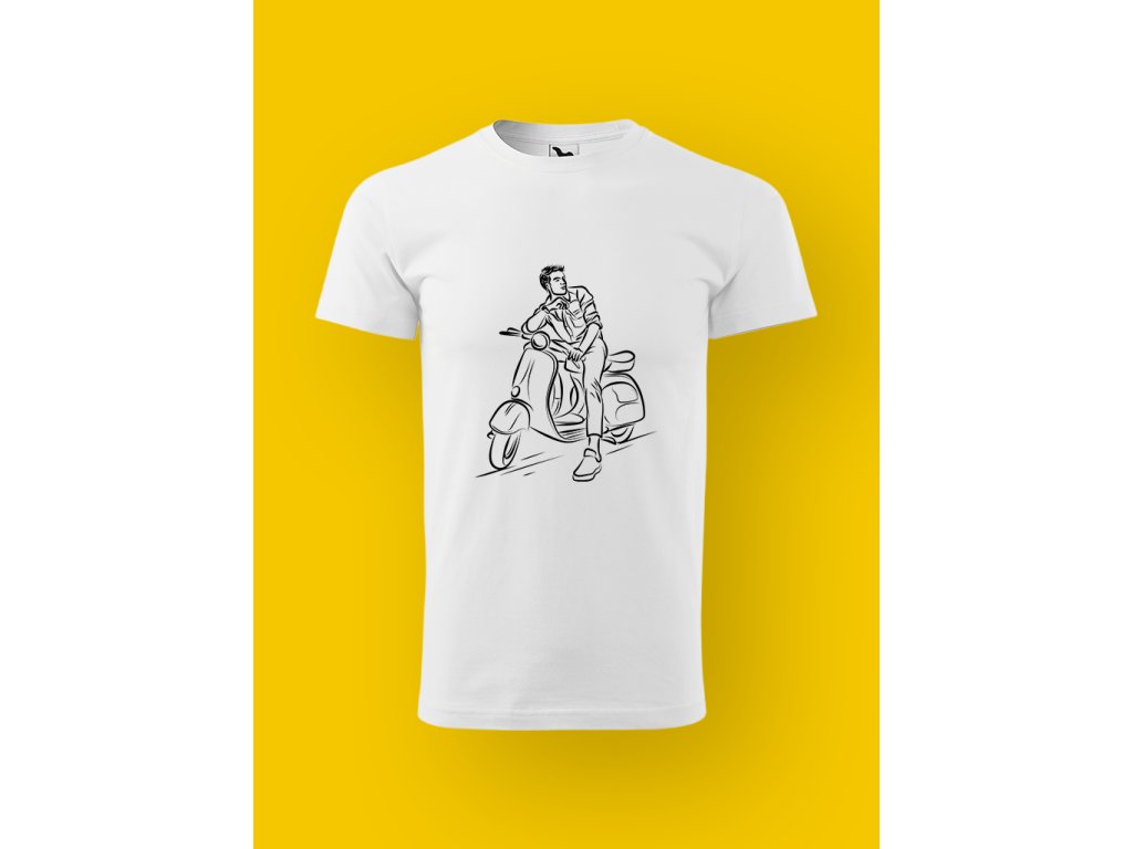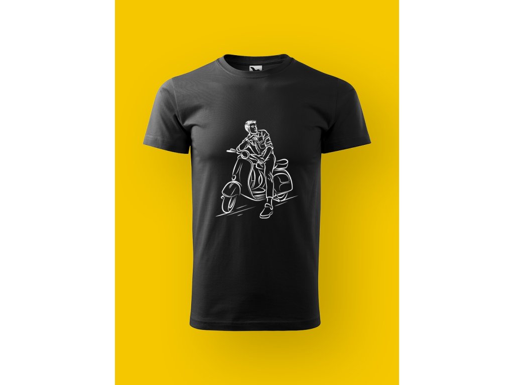 Tohle pánské tričko je o skútru a ničem jiným. Ne o velkým motoru, ne o machrování, ale o tom specifickým momentu, kdy stojíš u chodníku, máš skútr opřenej, nohu na zemi. Skútr je městskej parťák, co ví, že nervy nic neurychlí a že klid je větší rebelie než plyn.
