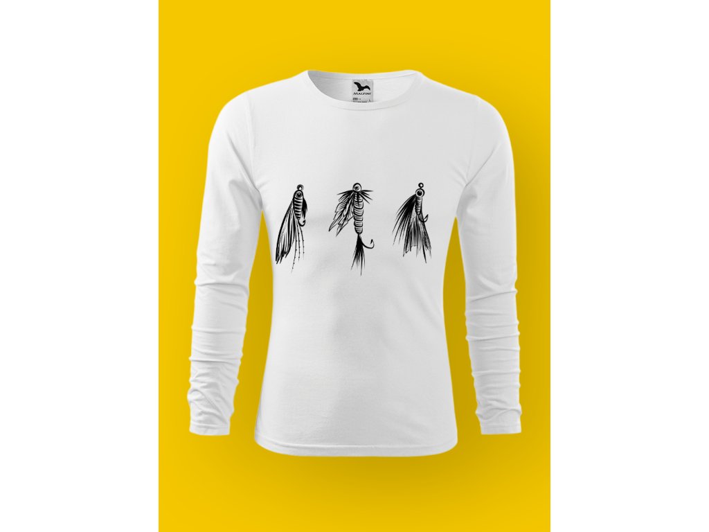 Tři krásně nakreslené mušky nejsou jen nástraha na pstruhy — jsou to malé zbraně, kterými vysíláš jasný signál: „Umím chytat. A nejen ryby.“ Motiv je jemný, elegantní, ale má dost ostrý háček, aby pobavil každého, kdo má rád vodu, rybaření a drsný humor.