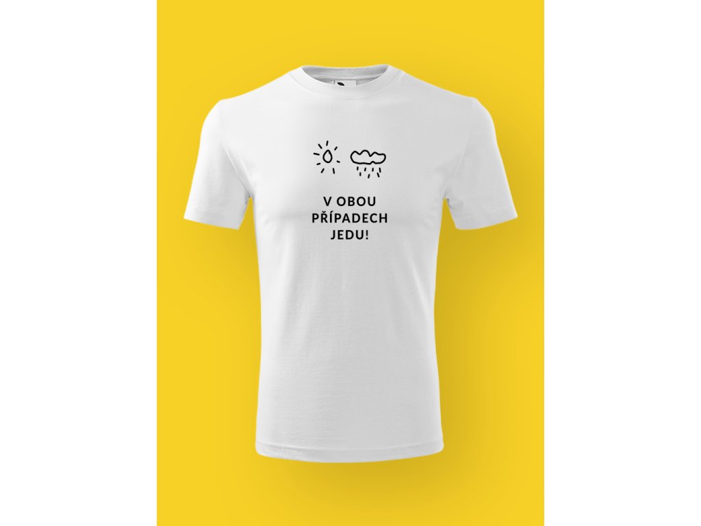 Tohle pánské tričko je jasná odpověď na věčnou otázku: „A co když bude pršet?“ Slunce nebo déšť, modrá nebo šedá obloha – je to úplně jedno. Ikony počasí to říkají jasně a nápis V OBOU PŘÍPADECH JEDU! to dorazí bez debat. Tohle není optimismus, to je rozhodnutí.